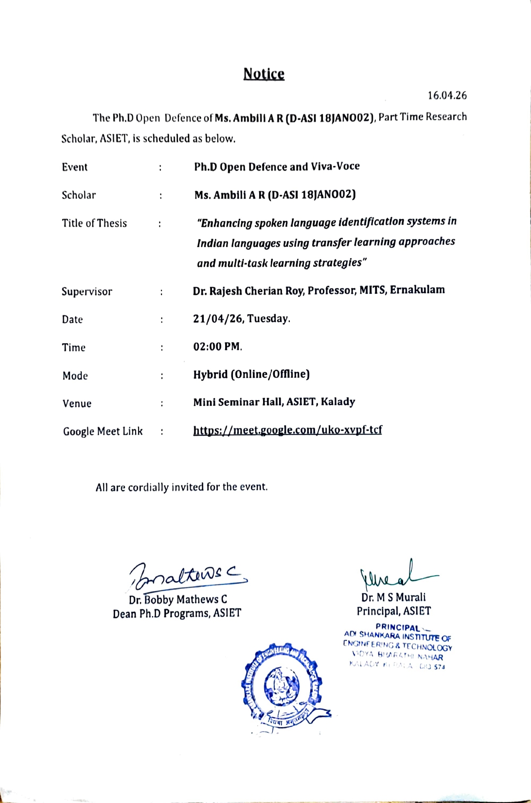 My experience with ASIET was very positive. The management of this college is very helpful to students to develop their skills, ability, knowledge of conducting courses, training programs. Staffs play a major role in career development. The institution has motivated me to explore my artistic talents. I am proud to graduate from this esteemed institution. With due respect and humility I thank my faculty and staffs who played an integral part in carving my future studies and career development. I wish ASIET to conquer great heights in future endeavours.