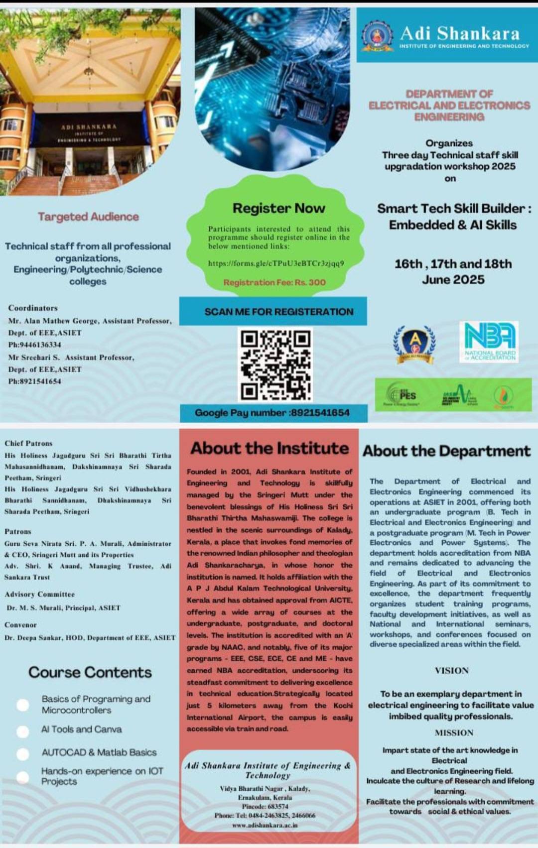 The Department of Electrical and Electronics Engineering organized a three-day Technical Staff Skill Upgradation Workshop, “Smart Tech Skill Builder: Embedded & AI Skills” from June 16 to 18, 2025. The workshop was designed for technical staff from engineering, polytechnic, and science colleges and aimed to enhance their practical knowledge and technical capabilities. It included sessions on programming basics, microcontrollers, AutoCAD, MATLAB, IoT projects, AI tools, and Canva. The sessions were handled by experts such as Sri. Juby John from Nest Cyber Campus, Aluva, along with Dr. Deepa Sankar,Prof. Meenakshi K V, Prof. Siji Jose, Prof. Remya Raveendran, and Prof. Sreehari S. The workshop was inaugurated by Dr. Ajay Kumar, HoD of ECE, and coordinated by Mr. Alan Mathew George and Mr. Sreehari S. |