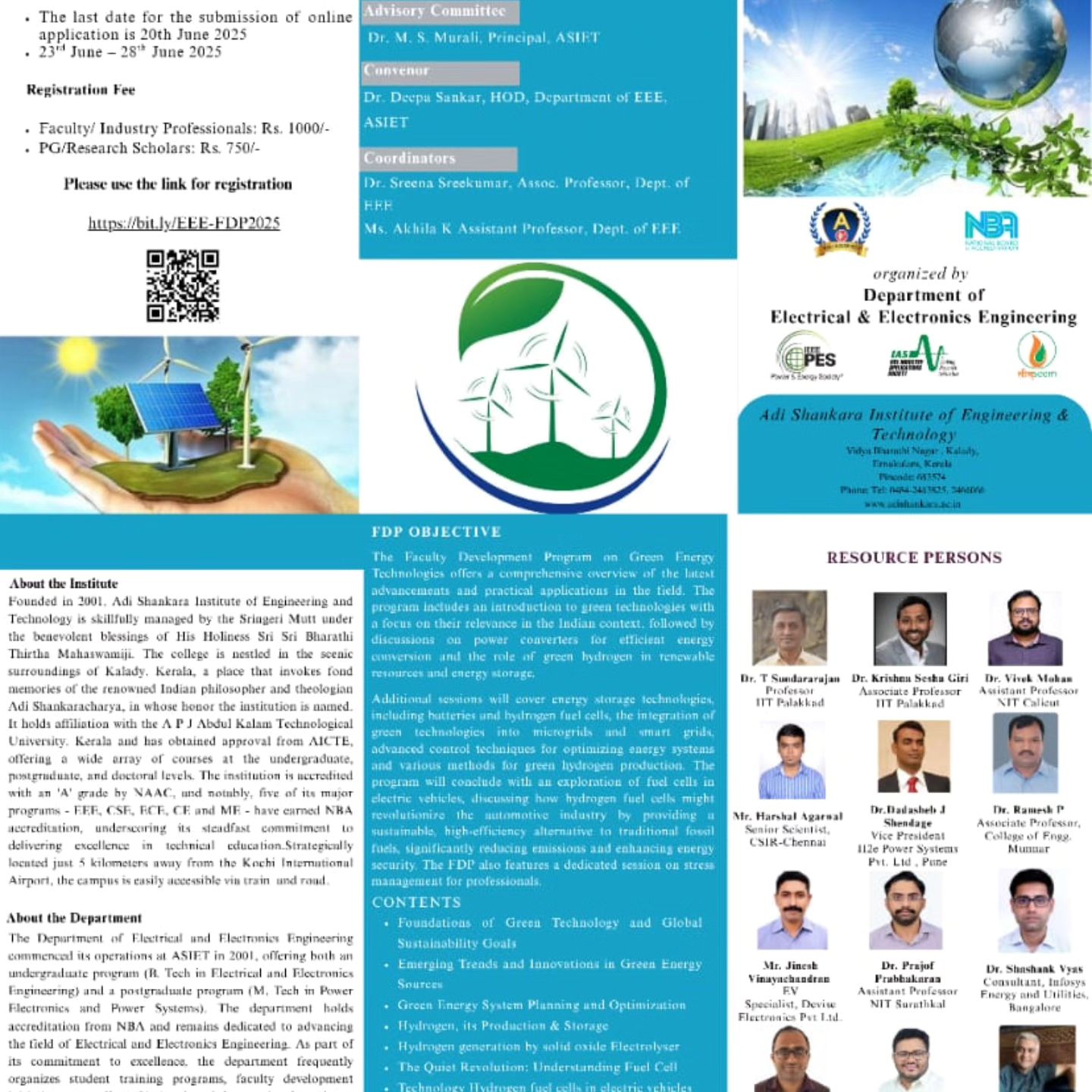 The EEE Department conducted a six-day Faculty Development Programme, “From Green to Hydrogen: Exploring Sustainable Energy Evolution” from June 23 to 28, 2025. The hybrid-mode FDP aimed to provide a comprehensive understanding of the latest trends and |