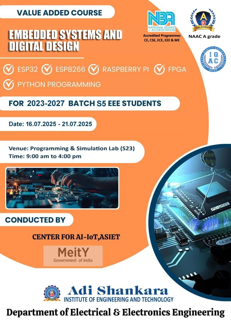 Value-added course on, “Embedded Systems and Digital Design” for the S5 EEE students was held from 16 to 21 July 2025 at the Programming & Simulation Lab. Topics covered included ESP32, ESP8266, Raspberry Pi,FPGA, and Python Programming. |