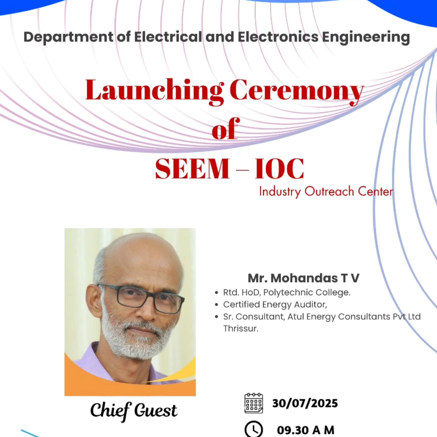 The Department of Electrical and Electronics Engineering marked the official inauguration of the SEEM- Industry Outreach Center (IOC) on July 30, 2025, at the college seminar hall. The ceremony began at 10:00 AM in the esteemed presence of Mr.Mohandas T V (Chief Guest), |