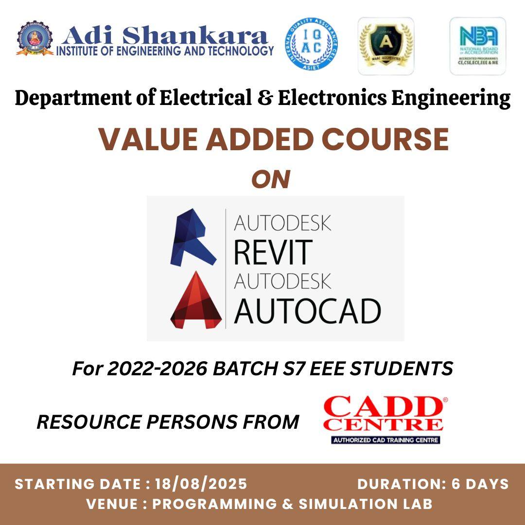 The EEE Department along with IQAC organized a six-day Value-Added Course on AutoCAD and Revit for the S7 EEE students. Commencing on 18 August 2025, the sessions were held in the Programming and Simulation Lab and were handled by expert resource persons from CADD Centre. |