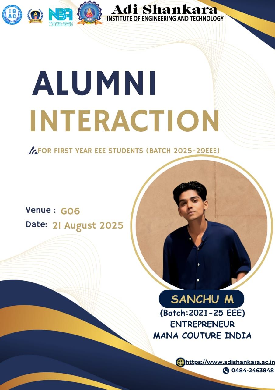 The EEE Department organized an Alumni Interaction on 21 August 2025 for the first-year EEE students (Batch 2025–29). The session featured Sanchu M, an alumnus from the 2021–25 EEE batch and entrepreneur at Mana Couture India. |