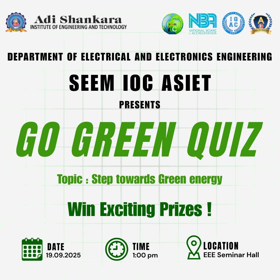 SEEM IOC ASIET, in association with the Department of EEE,organized the GO GREEN QUIZ on 19 September 2025 at the EEE Seminar Hall. The event aimed to promote awareness of green energy and sustainability through an engaging and competitive quiz. |