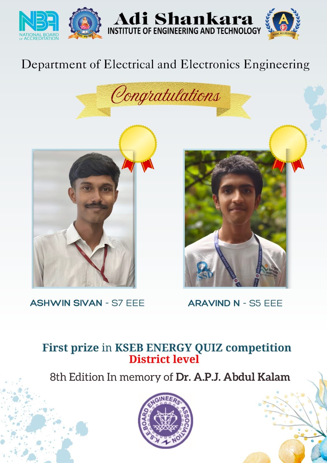 The Department of Electrical and Electronics Engineering, in association with the Quiz Club and KSEB Engineers’ Association, organized the Dr. APJ Abdul Kalam Energy Quiz Eighth Edition at the college level on 21 August 2025. |